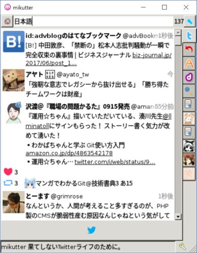 愛機MacBook Air(Mid 2012)の調子が悪くなったので、メインマシンを買い置きしていたThinkpad X1 Carbon(2016)に変更しました。*1画面が広い!重量も軽い!Windows10も結構使いやすくなってきてる!と概ね満足だったのですが、唯一の懸念事項がmikutter。 mi…